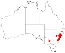 It has a limited distribution in coastal areas of central New South Wales from around Singleton to around the Shoalhaven River where it is found in a variety of habitats growing in many different soil types as a part of dry sclerophyll forest or woodland communities.[1]