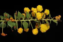 The shrub typically grows to a height of 1.5 to 2 metres (4.9 to 6.6 ft) and has an obconical open habit. It has erect branches that curve upwards and glabrous to sparsely hairy branchlets. The grey-green to green phyllodes are widely spreading and rotated on the branchlets. The phyllodes have a broadly elliptic to broadly obovate shape with a length of 12 to 22 mm (0.47 to 0.87 in) and a width 6 to 15 mm (0.24 to 0.59 in).[3] It flowers sporadically through the year and produces inflorescences that have spherical flower-heads with a diameter of 8 to 9 mm (0.31 to 0.35 in) containing 20 to 32 yellow to deep yellow flowers. After flowering oblong to curved dull dark brown seed pods form which are 35 to 80 mm (1.4 to 3.1 in) in length and 16 to 20 mm (0.63 to 0.79 in) wide.[3]