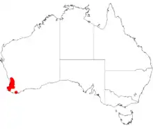 It is native to an area in the South West, Peel and Great Southern regions of Western Australia where it is commonly found growing in lateritic based soils.[1] The range of the plant extends from north of Binddon in the north down to the Whicher Range in the south. A single collection of the species has been made from around Albany where it is usually a part of Eucalyptus marginata or Eucalyptus wandoo forest communities.[2]