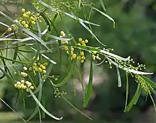 The tree has a slender and erect habit and typically grows to a height of up to 10 metres (32.8 ft). It has a bushy crown and usually has a single stem but can divide into several stems at ground level[1] which have smooth grey coloured bark. The branchlets are usually pendulous and are angled or flattened and a reddish-brown often covered with a white powdery finish.[2] It has straight or shallowly recurved, glabrous, blue-green to grey-green phyllodes[1] that have a narrowly oblanceolate to narrowly elliptic or linear shape with a length of 7 to 22 cm (2.8 to 8.7 in) and a width of 3 to 15 mm (0.12 to 0.59 in). It blooms throughout the year[3] but most heavily between September and January producing racemose inflorescences with spherical flower-heads containing between 18 and 50 flowered golden to pale yellow coloured flowers. After flowering linear brown seed pods form that are up 16 cm (6.3 in) in length and 5 to 17 mm (0.20 to 0.67 in) wide with a firm papery texture. The dull to slightly shiny dark brown to black seeds within the pods have an oblong to oblong-elliptic shape and a length of 4 to 6 mm (0.16 to 0.24 in).[2]