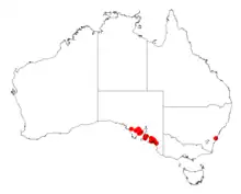 It is endemic to some small areas on the Eyre Peninsula in South Australia near Arno Bay extending to the Yorke Peninsula near Curramulka and then between the Gilbert River and Monarto where it is found growing in calcareous sandy or sandy-loamy soils as a part of open scrubland communities[3] that are dominated by Eucalyptus species.[2] The total area over which the shrub is found has been calculated as 4,976 km2 (1,921 sq mi).[1]