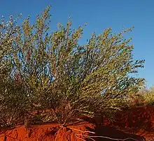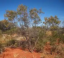 The multi-stemmed tree or shrub typically to a height of 1 to 6 metres (3 to 20 ft) and has a rounded bushy habit. It has light to dark grey coloured bark that is longitudinally fissured and forms small flakes. The terete branchlets are densely to sparsely puberulous and have broadly triangular dark brown stipules with a length of around 1 mm (0.039 in). The green, narrowly elliptically shaped phyllodes are flat and straight to shallowly incurved. Each phyllode has a length of 3.5 to 9.5 cm (1.4 to 3.7 in) and a width of 7 to 20 mm (0.28 to 0.79 in) with two or three prominent longitudinal main nerves.[1] Although it flowers across a wide time span over most of the continent, in Western Australia it is much more restricted, blooming only from May to September producing yellow flowers.[2] The dense flower spikes are paired in phyllode axils and have a length of 2 to 5 cm (0.79 to 1.97 in). After flowering linear, straight to curved seed pods form with a length of 5.5 to 13.5 cm (2.2 to 5.3 in) and a width of 3 to 4 mm (0.12 to 0.16 in). The dark brown seeds in the pod have a narrowly oblong shape and a length of around 5 mm (0.20 in).[1]