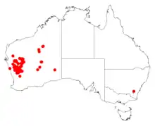 It is native to an area in the Gascoyne, Mid West and Goldfields-Esperance regions of Western Australia where it has a scattered distribution growing in sandy-clay-loam soils often over or around limestone or calcrete.[1] The shrub is found from between Gascoyne Junction and Peak Hill in the north to around Morawa and Mouroubra in the south with specimens also found around Lake Auld on the boundary of the Great Sandy Desert often as a part of low shrubland communities.[2]