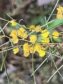 The rounded shrub typically grows to a height of 0.3 to 3 metres (1 to 10 ft)[1] and has cylindrical, weakly angled and glabrous to hairy branchlets. Like most species of Acacia it has phyllodes rather than true leaves. The evergreen phyllodes are straight to slightly curved with a length of 1 to 3.5 cm (0.39 to 1.38 in) and have a diameter of 0.7 to 1.5 mm (0.028 to 0.059 in) and have eight distant raised to plane nerves.[2] It blooms from August to October and produces yellow flowers.[1] The simple inflorescences occur in pairs in the axils and have spherical flower-heads with a diameter of 2.8 to 4.5 mm (0.11 to 0.18 in) containing 16 to 30 golden coloured flowers. Glabrous and thinly crustaceous seed pods form after flowering that have a linear shape but are slightly raised over and constricted between each of the seeds. The pods have a length of about 4 to 5 cm (1.6 to 2.0 in) and a width og 2.5 to 3.5 mm (0.098 to 0.138 in) and contain subglossy mottled blackish coloured seeds that have an elliptic or oblong-elliptic shape and are 2.5 to 3.5 mm (0.098 to 0.138 in) in length and have a crested aril.[2]