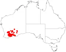 It is native to an area in the Wheatbelt and Goldfields-Esperance regions of Western Australia where it is commonly situated around salt flats and lakes, on slopes or sandplains growing in rocky loamy or sandy soils.[1] It has a scattered distribution with the bulk of the population found from Ongerup in the west to around the Wittenoom Hills approximately 50 km (31 mi) north of Esperance to the east and up to around Hyden in the north. Other outlying populations are found around Merredin, Kellerberrin and Boorabbin National Park as well as to the south of Zanthus where it is often a part of Banksia and Casuarina scrubland and Eucalyptus scrub-woodland communities.[2]