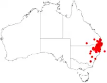 The is found in the Darling Downs region of south eastern Queensland and eastern parts of New South Wales. In Queensland the range extends as far west as Injune and in New South Wales as far west as around Coonabarabran where it is found un upland areas with granite based soils and is usually a part of low woodland communities along with species of Eucalyptus and other Acacias.[2] In New South Wales it is mostly located in the Tablelands Region from around Tamworth in the south out to Mount Kaputar National Park in the west and to around Tenterfield in the west where it is usually part of dry sclerophyll forest communities or among the heath in crevices of granite outcrops.[1]