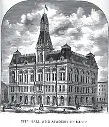 The Academy of Music (1874-1910) was a civic theater and the first city hall for the city of Cumberland, Allegany County, Maryland. It was a grand building with 18-inch (460 mm) thick walls, 78 feet (24 m) high from street to roof crest, and was 140 feet (43 m) high to the top of the tower. At the time, the building was built for a cost of $127,000 (approximately 2 million dollars in 2006 dollars). Construction began in 1874 and was finished in 1876.