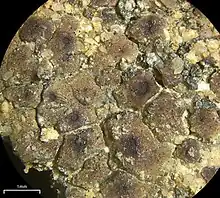 Acarospora obnubila ("cloudy cobblestone lichen") is a dull brown squamulose areolate crustose lichen that may grow up to 4 mm in diameter or with squamules scattered among other lichens.[1]: 217 [2] They are common in Arizona, southern California, and Baja California.[2] They grow by themselves on acidic rock in full sunlight.[2] Squamules measure up to 2 mm in diameter and are round to irregular, with have a stipe.[2][1]: 217 They may also grow on members of the genus Aspicilia (lichenicolous).[2] Competition for space with other lichens stimulates longer stipes to develop,[2] whereby the squamules may overlay other lichens.