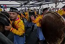 Traditional Acehnese dance portrays the heritage culture, religion and folklore of the common folk.[43] Acehnese dance are generally performed in groups, either in a standing or sitting position, and the group of dancers are of the same gender.[44] If seen from the musical standpoint, the dance can be grouped into two types. One is accompanied with vocals and physical percussive movements of the dancers themselves, and the other is simply accompanied by an assemble of musical instruments.[44]