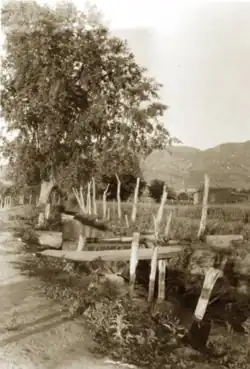 The Acequia Madre continues to flow annually through a ditch that is partially stone lined, and approximately one to two feet deep. Its width ranges from approximately two feet to five feet wide. Mature cottonwood trees grow along the ditch, mainly between the ditch and the adobe walls and coyote fences of various properties. Several historical houses are adjacent to the ditch, some of those along the south side still use acequia water to irrigate orchards, alfalfa and other grain fields, vegetable gardens. These plantings were watered by smaller ditches perpendicular to the Mother Ditch. It was a Spanish custom to deed land in parcels in long and narrow strips to such that each property had equal access to the acequia water. There was a historical mill at the intersection of Acequia Madre Road and Abeyta Street, where the Acequia del Ranchos (shown on the King Map) intersected with the Acequia Madre.[9]