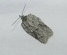 The wingspan is 22–27 mm. The forewings are light grey, with numerous scale-tufts. In the west, form ferruginiguttana occurs. This form has much deeper blue-grey forewings, variably mottled and suffused with smoky shades and often with small sub-basal and median dark patches in the fold.[3] Adults have been recorded on wing nearly year round depending on the location.
