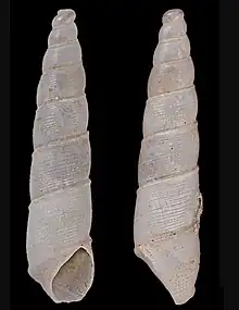 The elongated, turreted shell has a uniform white color. The spire is composed of eight whorls, separated by a closely channeled suture. The protoconch is embryonic, smooth and convex. The two following whorls are also convex, but decorated with striae slightly decurrent. The others are less convex adorned with more pronounced decurrent striae. They show, below the suture, a quite acute projecting keel, that extends around the base of the body whorl. The aperture is oval, angular at the top. The columella is arcuate, surrounded by a callous bead, acuminate at the base.[2]