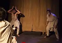 The conventions that govern acting in general are related to structured forms of play, which involve, in each specific experience, "rules of the game."[13] This aspect was first explored by Johan Huizinga (in Homo Ludens, 1938) and Roger Caillois (in Man, Play and Games, 1958).[14] Caillois, for example, distinguishes four aspects of play relevant to acting: mimesis (simulation), agon (conflict or competition), alea (chance), and ilinx (vertigo, or "vertiginous psychological situations" involving the spectator's identification or catharsis).[13] This connection with play as an activity was first proposed by Aristotle in his Poetics, in which he defines the desire to imitate in play as an essential part of being human and our first means of learning as children: