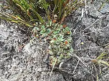 Actinotus bellidioides is a small rosette herb typically found in button grass moors, and other waterlogged habitats. The leaves are hairy and dark green, sometimes with toothed margins. The entire plant is usually about 3 cm (1.2 in) wide.[3]
