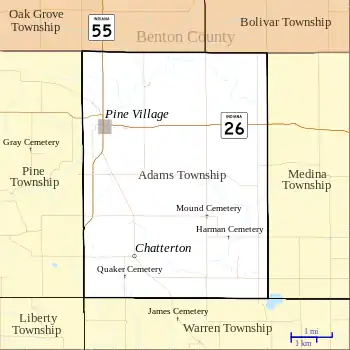 The township contains three cemeteries. Mound (or Round) Cemetery is about 4 miles southeast of Pine Village and is in the form of a mound about 30 feet (9.1 m) high; county roads 700 N and 600 E intersect here and form a circle around the mound.[6] Harman Cemetery is less than a mile further to the southeast.[7] Quaker Cemetery is southwest of Chatterton.[8][9]