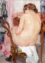 He initially worked as a graphic artist for the weekly art magazine, Jugend. Later, he created posters and other advertising materials, which were not very profitable. He participated in exhibits by Die Scholle, but received little attention from the art critics.[2] In 1906, calling himself "reumütig" (repentant), he decided to focus entirely on painting.[1] He did, however, teach at the Damenakademie, to provide a steady income.[3] This also enabled him to afford a studio in Schwabing, Munich's Bohemian quarter. He had a relationship with one of his students, Nadine von Enckevort, which never led to marriage due to the differences in their social status and age.
