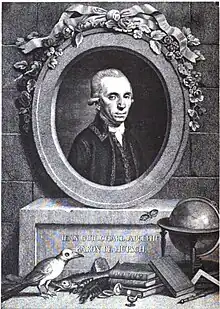 Hüpsch was born to as Jean Guilleaume Fiacre, the son of a court official Gerard Honvlez (d. 1746) and Anna Maria Kesler in Vielsalm (now in Belgium). He studied at the Marianum in Aachen and the Tricoronatum Gymnasium in Cologne (1749-50) before studying law, medicine, and natural sciences in Cologne. In 1755 he took the title and surname from his grandmother von Hupsch from Lontzen. He published various books on geophenomenology (1764), natural history of lower Germany (1781) and on ancient inscriptions in 1801. He gradually enhanced his name and titles and called himself Johann Wilhelm Carl Adolph Freiherr von Hüpsch, Herr zu Lotzen, zu Krickelhausen und auf der Motte claiming a pedigree back to the Roman family of Aemilianus. He made money selling patent medicines and from 1768 lived in the Lützeroder farm. He filled his home with collections and his housekeeper Mechtild Happertz (1725 – 1805) gave tours of his cabinet to visitors. In his will, he appointed the collector Ludwig X, Landgrave of Hesse-Darmstadt as his heir. Ludwig had purchased the mineral collection of Hüpsch in 1802. Many of his collections are now in the Hessisches Landesmuseum Darmstadt.[1][2][3][4]