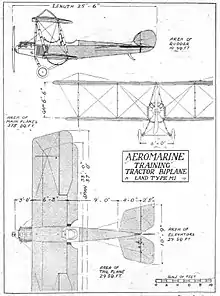 Originally known as Aeromarine Training Tractor, Aeromarine's chief designer, Charles F. Willard,[1] designed a two place trainer in both land-plane and seaplane configuration. The land plane was designated the Aeromarine M-1 and was produced to US Army Specification No.1001.[2] The seaplane version was later called the Aeromarine 39 and sold to the United States Navy (USN). Both aircraft shared much in common, aside from the undercarriage, the primary difference was that the M-1's wingspan was shorter than the Aeromarine 39.