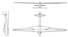The competition stipulated the 15 m (49 ft 3 in) span gliders had to be wooden, though fabric covering could be used.[1] Its cantilever wing was built around a single spar[2] with plywood skinning around the wing forward of it. The wing was attached to a pylon about 230 mm (9 in) above the fuselage and at the centreline the wing ply extended back to about 70% chord, returning to the spar about 1 m (3 ft 3 in) along it. The wing planform was strongly double straight tapered, mostly on the trailing edge where ailerons occupied almost half the span.[1] These were split into two nearly equal sections and acted differentially. Parallel ruler type airbrakes were placed a little inboard of the ailerons, at mid-chord.[2] Near the roots the airfoil section was NACA 4514; further out this was tapered into the symmetric NACA 0012 of the tips, which had 4° of washout to prevent tip stalling.[1]