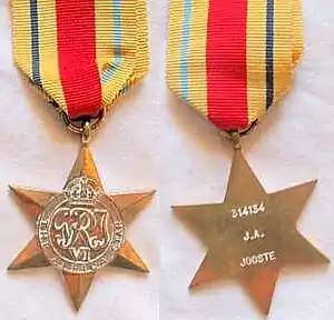 The British Honours Committee decided that Second World War campaign medals awarded to British forces would be issued unnamed,[22] a policy applied by all but three British Commonwealth countries. The recipient's name was impressed on the reverse of the stars awarded to Indians, South Africans and, after a campaign led by veteran organisations, to Australians.[23] In the case of Indians, naming consisted of the recipient's force number, rank, initials, surname and service arm or corps, and in the case of South Africans of the force number, initials and surname, in block capitals.[1][18][24][25]