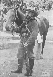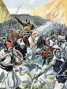 Military and diplomatic links with other nations such as Imperial Russia (chief military mission in the war-time were also established, with personnel such as Nikolay Leontiev) leading a mission of Russian military advisers and volunteers to aid in modernizing Menelik's army. Other officers such as Leonid Artamonov, a Russian general, geographer and traveler, were also military advisers of Menelik II. Leontiev would command Russian volunteers, advisers at the Adwa battlefield.[56] [57][58] [59][60] Historian Bruce Vandervort in Wars of Imperial Conquest in Africa, 1830–1914, notes that around 100,000 Ethiopian soldiers fought at Adowa, with about 70,000 of them carrying modern repeating rifles. The bulk of these were infantry. The remaining 30,000 men fought with traditional weapons- spear, sword and buffalo-hide shield.[61] The Ethiopians also deployed a number of machine guns, and were the only Africans to employ artillery to any extent during the colonial wars. Some of their gunners were foreign, but many were indigenous artillerymen, who took over the batteries captured from the Egyptians. The performance of the artillery arm proved a key factor in the Ethiopian victory. Their "quick- firing Hotchkiss artillery forced the surrender of an Italian fort in the run-up to the battle of Adowa, and actually outgunned an Italian battery at a crucial point during the battle itself.".[61] In many ways the Ethiopian army at Adowa was a traditional one that lacked the industrial base and elaborated military establishment of the typical European force. Proficiency however had been gained through long years of campaigning, as the various emperors consolidated power over internal and external foes.
