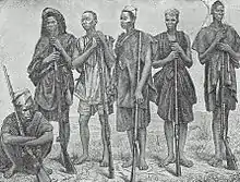 Individualized acts of daring were encouraged, such as rushing out into the open to chop off the heads of wounded or dead enemies. A tally of these trophies was presented to the commanding general after the end of the engagement.[17] Severe discipline prevailed in the Ashanti armies. Soldiers who faltered were whipped or slashed with heavy swords carried by special contingents of "enforcer" troops – the "sword-bearers." Ashanti soldiers had to memorize the following saying: "If I go forward, I die; if I flee, I die. Better to go forward and die in the mouth of battle." Generally the "enforcers" were deployed forward, between the scouts and the main force. They eased back as the battle started to better observe and intimidate the weary and faltering.[20] In a feature seldom seen among armies at that point in history, the Ashanti also deployed units of medical personnel behind the main forces, who were tasked with caring for the wounded and removing the dead.[21]