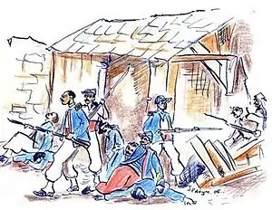 French investments to crush the resistance were massive. By 1839 they had concentrated some 70,000 men in Algeria. By 1844, a third of the French Army was fighting in Algeria – some 108,000 troops – a stark and extraordinary contrast to the typically small European or European-led forces that conquered most of Africa.[28] French tactics changed to counter the swift guerrilla attacks of the native resistance. Heavy formations were broken down into mobile columns, and a ruthless "scorched earth" policy of devastation, plunder and destruction was enacted- seeking to break the native resistance by destruction of its resource base. Wells were poisoned, livestock shot, fields, houses and villages burned, and inhabitants driven into the countryside or exterminated. The ruinous devastation of the countryside severely hurt the Emir's war-making efforts, as did the seizure of his strongholds by the mobile columns. By 1844, El-Kader was forced to withdraw from Algeria to Morocco. Subsequent developments saw his capture and imprisonment by the French, who confiscated massive quantities of native land for settlement of French colons or settlers. This set the stage for an equally bloody resistance war, a century later.[27]