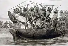 In the Niger Delta, the bigger Itsekiri war canoes mounted multiple cannon and swivels, and carried 40 rowers and 100 warriors, with slaves doing most of the rowing duties. Slaves were also tasked with providing food for the canoe men.[10] Commerce sometimes operated closely with war-making. Itsekiri traders operated their own fleets of fighting vessels, and the British navy was often unable to stop these fast-moving warrior-merchants as they flitted between the streams, lagoons and waterways of the Delta. On several occasions they fended off British warships by blockading narrow creeks and waterways, and in disputes with the colonial regime or European merchants, shut down trade on the Benin river for several months.[10] Pirates also made use of fast canoes to plague commerce and local citizenry alike. War-canoe ports were often fortified with extensive stockades, and multiple trench lines, behind which teams of gunmen and other fighters were marshalled for defense.[9][10] Some European slave-traders and their allies also made use of big canoes in their operations, plying the waterways in heavy vessels backed with musketeers and armed with small cannon, as they collected their human cargo for transport to the Americas.[11]