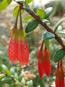 Agapetes serpens is a semi-climbing shrub species native to the Himalayas. 40–60 cm tall, it is grown as an ornamental for its attractive pendulous branches of red tubular flowers blooming over a long period. It is mostly grown in climates from cool temperate to sub-tropical. Propagation is from cuttings.