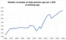 Pensions are an additional problem, and are expected to continue to rise as the population gets older.[18][6][19] £96.7 billion was paid out in pensions in 2018 alone, with an increase of £1.2 billion from the previous year.[6] Proposed plans to alleviate the problem have been rising the pension age more.[20]