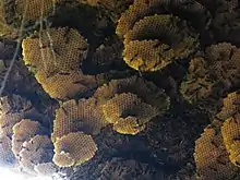 A. vicina are known to create outstandingly large nests. The combs themselves are generally horizontal and fairly even, neither convex nor concave. The cells face downward and comb layers are vertically connected by petioles. The bottom combs resemble stratified layers while the top combs expand concentrically to form a singular huge comb. When there are spatial limitations the top most layer stops concentrically expanding, leaving the final shape of the nest to be ellipsoid. The brood is always concentrated near the center of the nest, while peripheral cells are left empty as a means of enveloping the structure.[4]