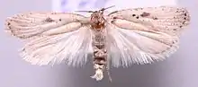 The wingspan is 19–23 mm. The forewings are pale greyish ochreous, with a few black scales; veins sometimes marked with cloudy dark fuscous streaks; first discal stigma black, preceded by a similar dot obliquely above it, second white edged with dark fuscous; a dark fuscous spot between and above these; black terminal dots. Hindwings pale whitish-fuscous. The larva is yellowish-green; head black[2]