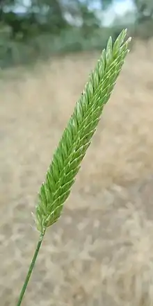 Agropyron cristatum is one of several closely related grass species referred to as crested wheatgrass. It is unable to hybridize with its similar relatives, as it is a diploid species, whereas its closest relative, Agropyron desertorum, is a tetraploid species.[1] It was introduced from Russia and Siberia to North America in the first half of the twentieth century, and widely used to reseed abandoned marginal cropland undergoing varying degrees of soil erosion and secondary succession.[2] A. cristatum is very long lived, with stands often remaining productive for 30 years or more.[3]
