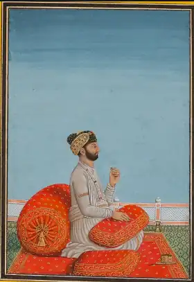 After his return to Farrukhabad, Ahmad Khan soon became prosperous again and a school of painting developed under him.[18] He began spending most of his time at the imperial court in Delhi. According to J.L. Gommans, he lived a luxurious life there and "started to pilfer precious books and paintings from the imperial stores".[8] In 1756, Ahmad Khan cultivated a close friendship with the Mughal nobleman Imad-ul-Mulk, who appointed Ahmad Khan as Amir-ul-Umara and Mir Bakhshi of the Mughal Empire on the dismissal of Najib-ud-Daula.[4][19][20] Ahmad Khan became a leading figure in court owing to Imad-ul-Mulk and became the leader of the Indo-Afghan noblity.[8]