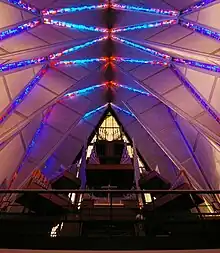 The most striking aspect of the chapel is its row of seventeen spires. The original design called for twenty-one spires, but this number was reduced due to budget issues.[4] The structure is a tubular steel frame of 100 identical tetrahedrons, each 75 feet (23 m) long, weighing five tons, and enclosed with aluminum panels. The panels were fabricated in Missouri and shipped by rail to the site. The tetrahedrons are spaced a foot apart, creating gaps in the framework that are filled with 1-inch-thick (25 mm) colored glass. The tetrahedrons comprising the spires are filled by triangular aluminum panels, while the tetrahedrons between the spires are filled with a mosaic of colored glass in aluminum frame.