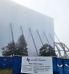 The Chapel closed in September 2019 for a $158 million renovation and restoration project needed to address water damage. Netsch's original plans included a series of rain gutters underneath the aluminum exterior of the chapel's spires, but these were not built due to budget constraints. The seams between the panels were caulked instead. Though the seams were repeatedly re-caulked over the years, decades of leaks left extensive water damage to the main floor and its fixtures. During the renovation, an enormous temporary "hangar", or as cadets call it- "The Box" , was built over the existing structure to allow workers to remove the aluminum panels and stained glass blocks and install the originally-designed rain gutters. The chapel's furniture and pipe organs are also being cleaned and repaired as well. The project was originally scheduled to be completed by November 2022.[5] In November 2021, the academy's campus architect, Duane Boyle, said that the project will miss its original completion date, after construction crews discovered more asbestos inside the chapel's structure than expected, requiring additional time for remediation.[6] The renovations are presently scheduled to be completed in 2027.[7]