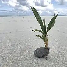 The flora of Aitutaki is highly modified, and on the main island only a few patches of degraded native forest survive near the airstrip.[33] The main island's ecology can be divided into four zones.[34] The coastal flat is dominated by Guettarda speciosa, coconuts, Hibiscus, Pandanus, and Hernandia moerenhoutiana.[34] The slopes are mostly Hibiscus tiliaceus interspersed with taro patches. The inland plateau is extensively cultivated, with plantations of coconuts, banana, citrus, and other food plants, as well as assorted introduced decorative shrubs.[34] The high ground on the island was cleared during World War 2 for military installations and now consists of grasses and weedy species.[34] The motu have Pemphis acidula scrub on the seaward side, phasing to Suriana scrub and coconut forest, with the volcanic islands containing forests of Calophyllum inophyllum which are not found on the other motu.[35]