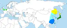 The species was once widespread in East Asia, but large-scale exports and the destruction of its forest habitat have reduced populations in eastern Russia and in China to below 1,000 pairs in each country; Japan, however, is thought to still hold some 5,000 pairs. The Asian populations are migratory, overwintering in lowland eastern China and southern Japan.[6]