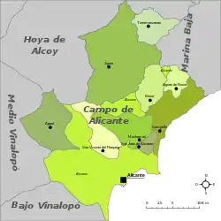 Alacantí (in Valencian and local Spanish)[lower-alpha 1][lower-alpha 2]—also known in Spanish as Campo de Alicante[2][lower-alpha 2] and Comarca de Alicante[lower-alpha 2]—is a comarca in the Valencian Community, Spain. It is bordered by the comarques of Marina Baixa and Alcoià to the north, Baix Vinalopó to the south and Vinalopó Mitjà to the west.