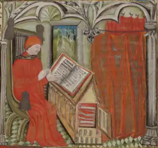 Alain's earliest poems were likely the Lai de Plaisance (Lay of Pleasure) followed by the Débat des Deux Fortunés en Amours (Debate of the Two Lovers) also called the Débat du Gras et du Maigre (Debate of the Fat and the Thin).[6] The Livre des Quatre Dames (1416) was written after the Battle of Agincourt. In 1422 he wrote the famous Quadrilogue invectif. The interlocutors in this dialogue are an allegorical representation of France and the three orders of the state, the Clergy, Knight, and People.[7] Chartier lays bare the abuses of the feudal army and the sufferings of the peasants. He maintains that the cause of France, though desperate to all appearance, was not yet lost if the contending factions could lay aside their differences in the face of the common enemy.[5] He also wrote Débat du reveille-matin (1422–26?), La Belle Dame sans Mercy (1424), and others.[4][5] In 1429 he wrote the Livre de l'Espérance, which contains a fierce attack on the nobility and clergy. He was the author of a diatribe on the courtiers of Charles VII, entitled Le Curial, translated into English by William Caxton about 1484.[5]