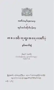 The first two publications did not explicitly state the author's name, leaving it as "a wise man from the time of Alaungpaya". When it was published again together with other chronicles in 1923, the authorship was attributed to Twinthin Taikwun Maha Sithu. But colonial period historians Pe Maung Tin and Maung Maung Gyi both later corrected the author to Letwe Nawrahta.[3] However, more recent scholars Hla Thamein (the editor of the 1961 publication of both versions),[4] Yi Yi and Kyauk Taing all say the 1883 version was written by Twinthin Taikwun, while Thaw Kaung sides with earlier historians, and says it was Letwe Nawrahta.[3]