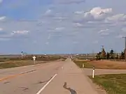 Highway 2A north of Crossfield in the foreground with divided Highway 2 in the distance.