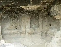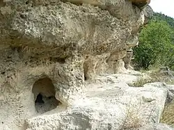 The monastery complex was built in the limestone rock massif on the northern side of the river, on some 25 metres height, using shallow natural caves and rock sheds, with additionally hewn premises and niches with religious and every-day purposes. The monastery is reached by a steep and narrow sandy pathway in the beginning of which was constructed a water tap, known as Haiduk cheshma. Being easily accessible, in later times the cave monastery was used by shepherds and stone-cutters as a shelter, and robbed and vandalized by treasure-hunters.