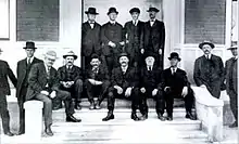 A photograph taken in 1912 entitled Founders of Buffalo. Alex Laing is fourth from the left on the bottom row