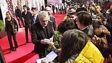 Production began in fall 2016 for Cuarón's eighth film, Roma, a tale of a housekeeper for a middle class Mexican family in 1970s Mexico City, based on the life of his family's longtime maid, Liboria Rodríguez.[19] The project was produced by Cuarón, Gabriela Rodríguez and Nicolás Celis and starred Yalitza Aparicio and Marina de Tavira both of whom received Oscar nominations. The film debuted at the 75th Venice International Film Festival, where it won the Golden Lion,[20] and was distributed to select Mexican and American theaters before its online release on Netflix. Roma was highly acclaimed upon release; among its accolades are two Golden Globes (Golden Globe Award for Best Foreign Language Film and Best Director for Cuarón) and three Academy Awards (Best Director, Best Foreign Language Film, and Best Cinematography for Cuarón) out of a leading ten nominations.[21][22]