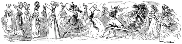 A ca. 1870s caricature by Grévin which seems to express his view of the progressive downfall of women's fashions over the course of the nineteenth century so far.