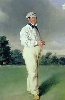 Alfred Mynn (19 January 1807 – 1 November 1861) was an English first-class cricketer during the game's "Roundarm Era". He was a genuine all-rounder, being both an attacking right-handed batsman and a formidable right arm fast bowler. Cricket writer John Woodcock ranked him as the fourth greatest cricketer of all time.[1] Simon Wilde wrote of him: "The speed at which Mynn bowled... and his life-size personality captured the imagination of the public in a way no cricketer had before."[2]