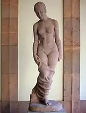 After a short stay in Munich Thiele returned to Leipzig and embarked on a career as a freelance artist. Starting in 1910, his work involved medallions and wall-mounted plaques. From 1911 he became more focused on figurines and participation in exhibitions. His early style reflected the naturalist and Jugendstil influences of the time, but during the 1920s he moved on through expressionism to so-called new realism. Influenced by Aristide Maillol and Wilhelm Lehmbruck, his artistic interest turned towards the presentation of physical movement and expressions of the human body. By 1928 he had become sufficiently well known to justify a newspaper headline that read "There is only one sculptor in Leipzig: Alfred Thiele!" ("Es gibt nur einen Bildhauer in Leipzig: Alfred Thiele!").[4] During the 1930s he began to apply the skills acquired working on small figures to much larger figures. Thiele applies his outstanding powers of observation, his sense for movement and other specialist abilities to developing a mastery of animal sculptures. Some of his designs were reproduced on an industrial scale by the Schaubach firm, offered as both glazed and unglazed porcelain figures. He also applied himself to statues other adornments for monumental grave stones.