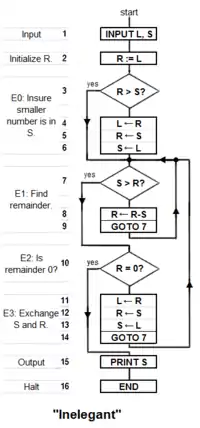 A prototypical example of an algorithm is the Euclidean algorithm, which is used to determine the maximum common divisor of two integers; an example (there are others) is described by the flowchart above and as an example in a later section.