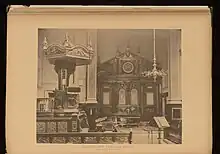 The church was 84 feet (26 m) long and 52 feet (16 m) wide. The interior was a simple undivided space, without aisles; a gallery at the west end was supported on a single column. The ceiling was coved at the sides. There were five windows on the north side, and four on the south, but the only illumination at the east end was through two small windows in the side walls of the recess housing the reredos. In 1880 additional lighting was provided by inserting a rectangular skylight in the ceiling.[1] The walls were panelled with oak to the height of 9 feet (2.7 m). Above the northern doorcase stood a wooden figure of Death, about four feet high, and over the southern one was a similar figure of Time. The upper parts of each of these doorcases were carved with openwork decoration "the view whereof is intercepted by an artificial white curtain, likewise carved, but so natural that many have attempted to draw it on one side".[5] The Corporation pew, in the south-east corner, had two sword-rests. There were high-backed seats for the churchwardens, their ends ornamented with the Lion and Unicorn. Attached to the wall in the vestibule was a frame containing shelves for loaves for distribution to the poor.[1] There was an oak reredos, ornamented with a carved pelican and seven candlesticks.[6]